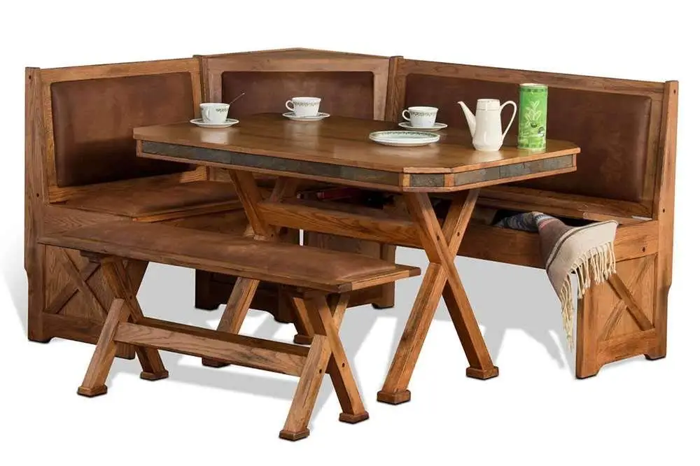 Breakfast nook storage is a great way to store linens, table. Corner breakfast nook table sets are great options for those with space restraints. The contrasting finishes on this corner nook give it a traditional farm house appeal. The table itself features a sleek white glass surface, sure to heighten any contemporary setting. The mezzanine shoppe 25513nwh knox modern 3 piece corner dining nook set natural/white.